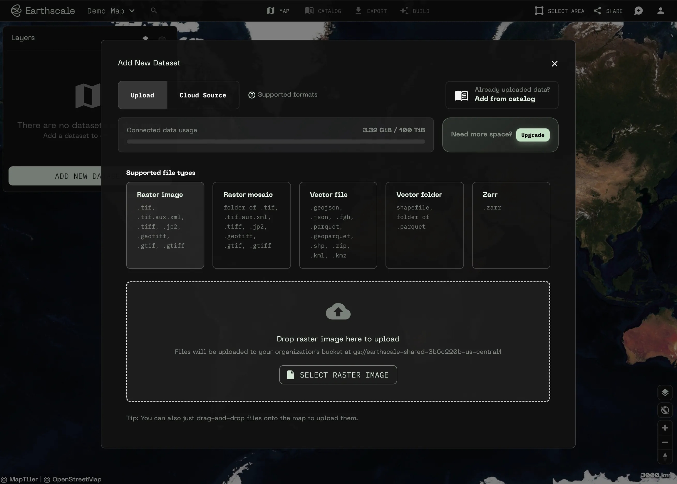 Earthscale allows you to upload folders or individual files from your machine to share and serve alongside other cloud-based datasets.