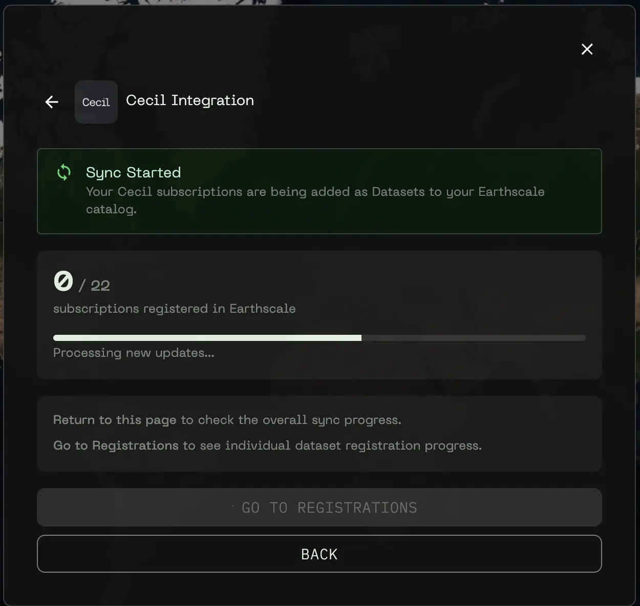 After connecting, you can sync your existing Cecil subscriptions with Earthscale. This imports each subscription as a dataset in your catalog.
