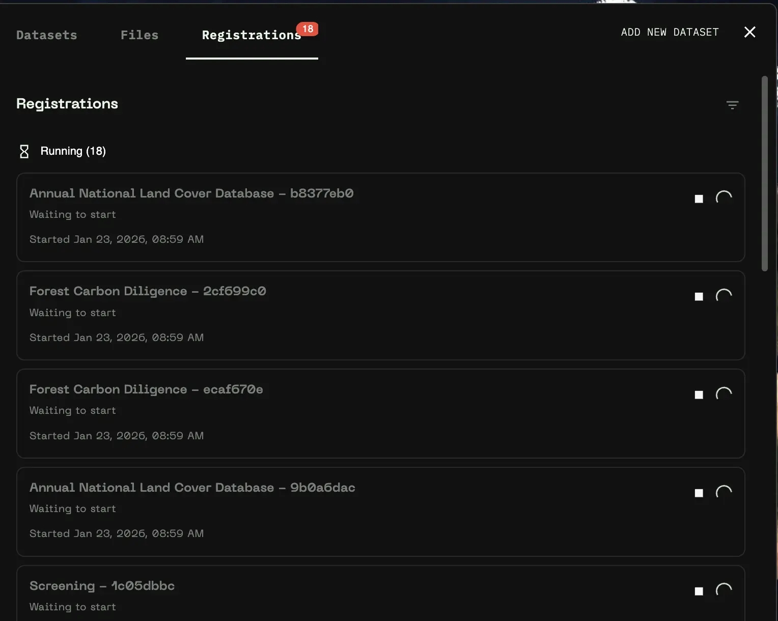 You can monitor individual dataset registration progress by clicking Go to Registrations or navigating to the Registrations view from the sidebar. The entire process may take a few minutes or longer depending on how many subscriptiosn you have. This process does not copy any data.